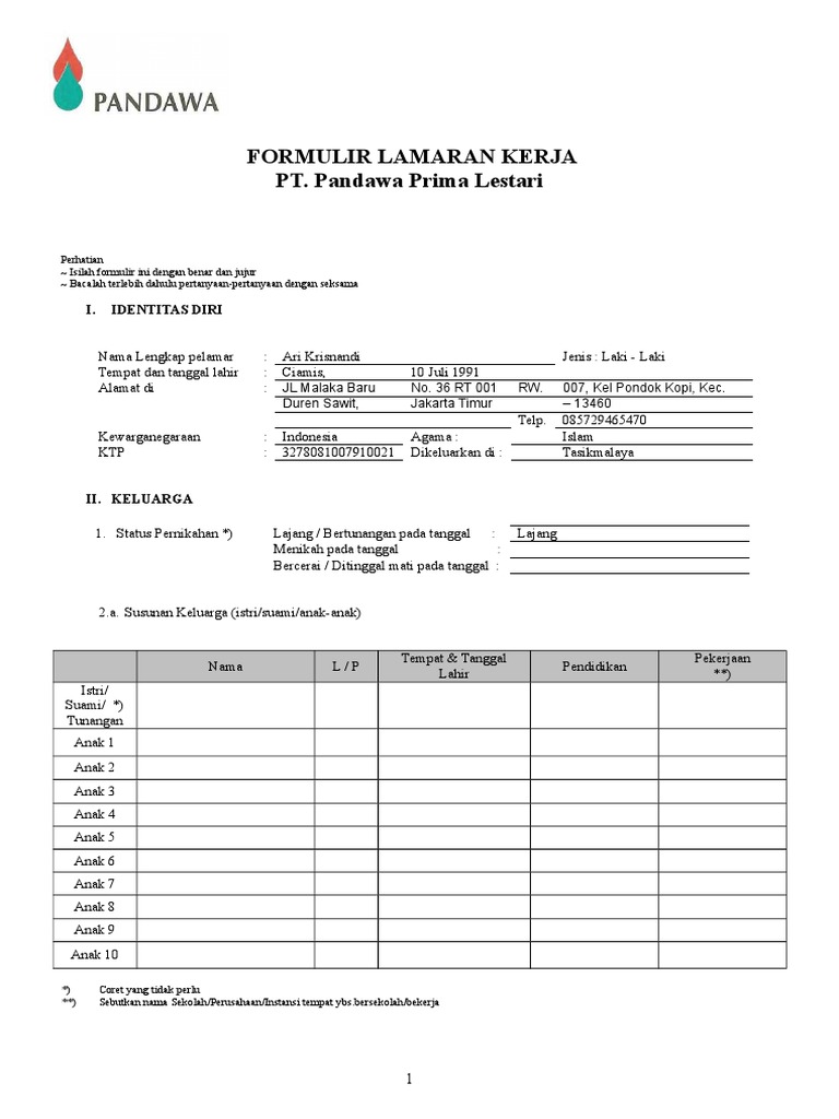 Fillable Online 1 Application Form Zamalah Lestari Part A