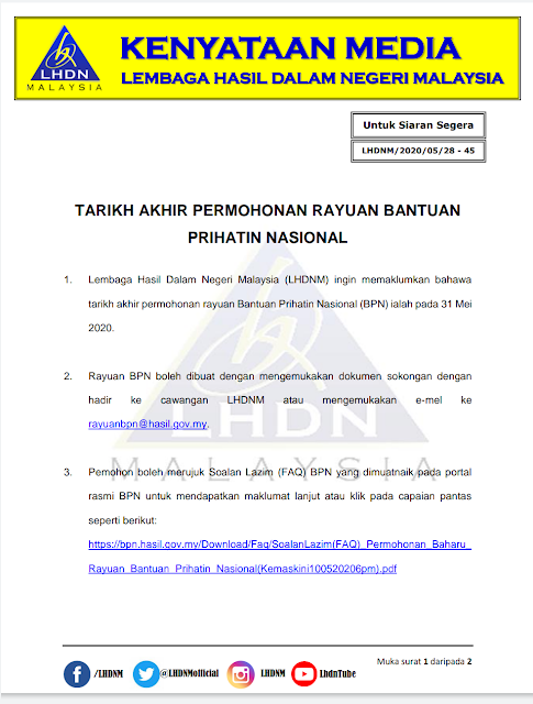 Tarikh Akhir Permohonan Rayuan Bantuan Prihatin Nasional 31 05 2020
